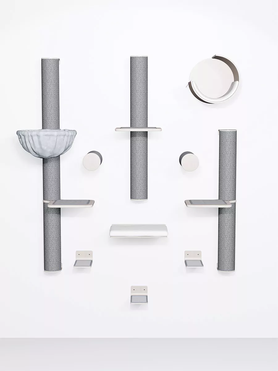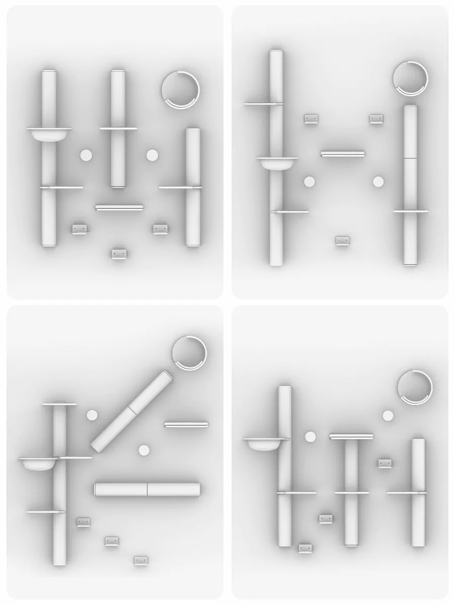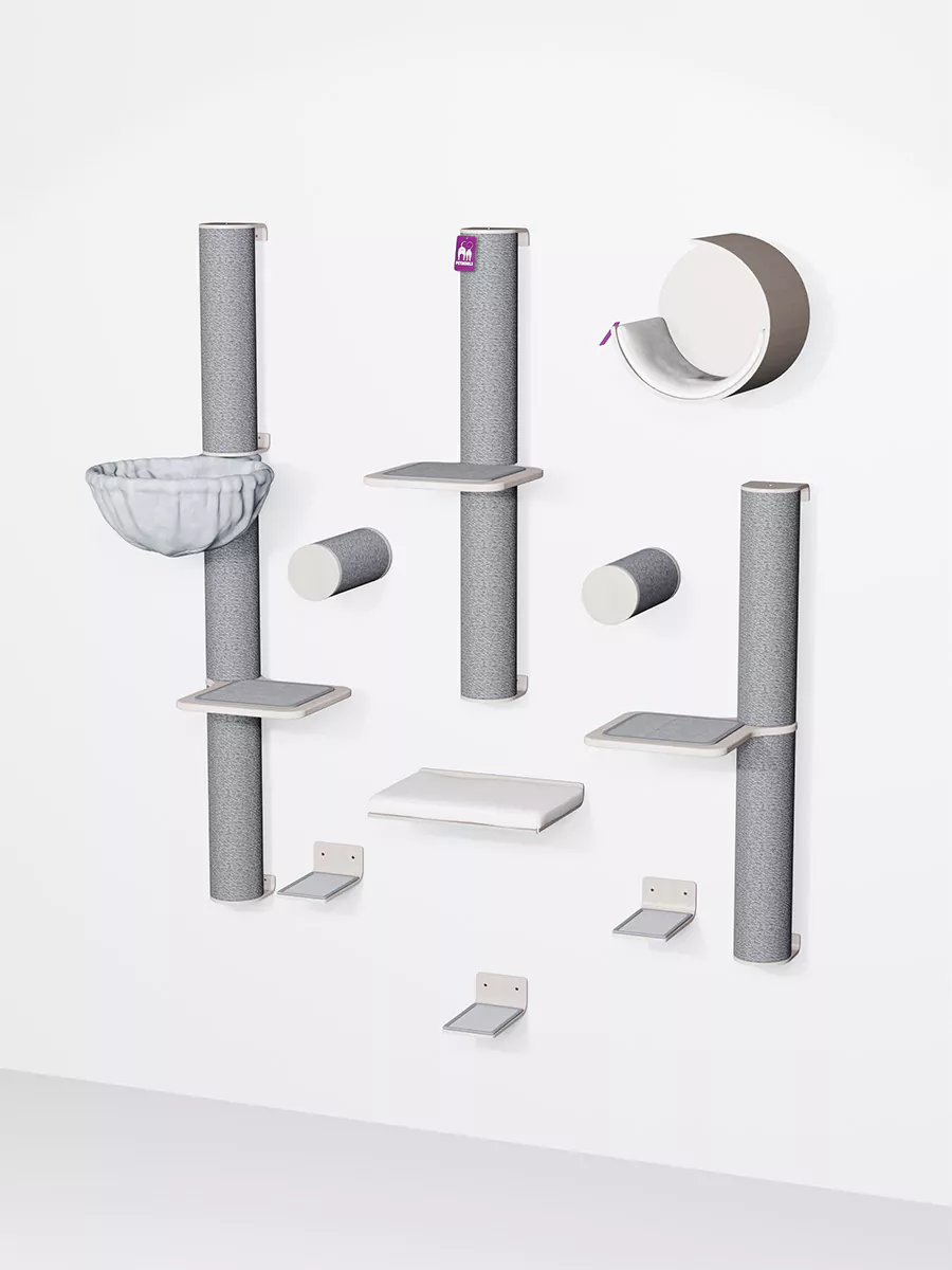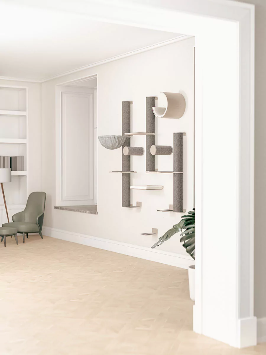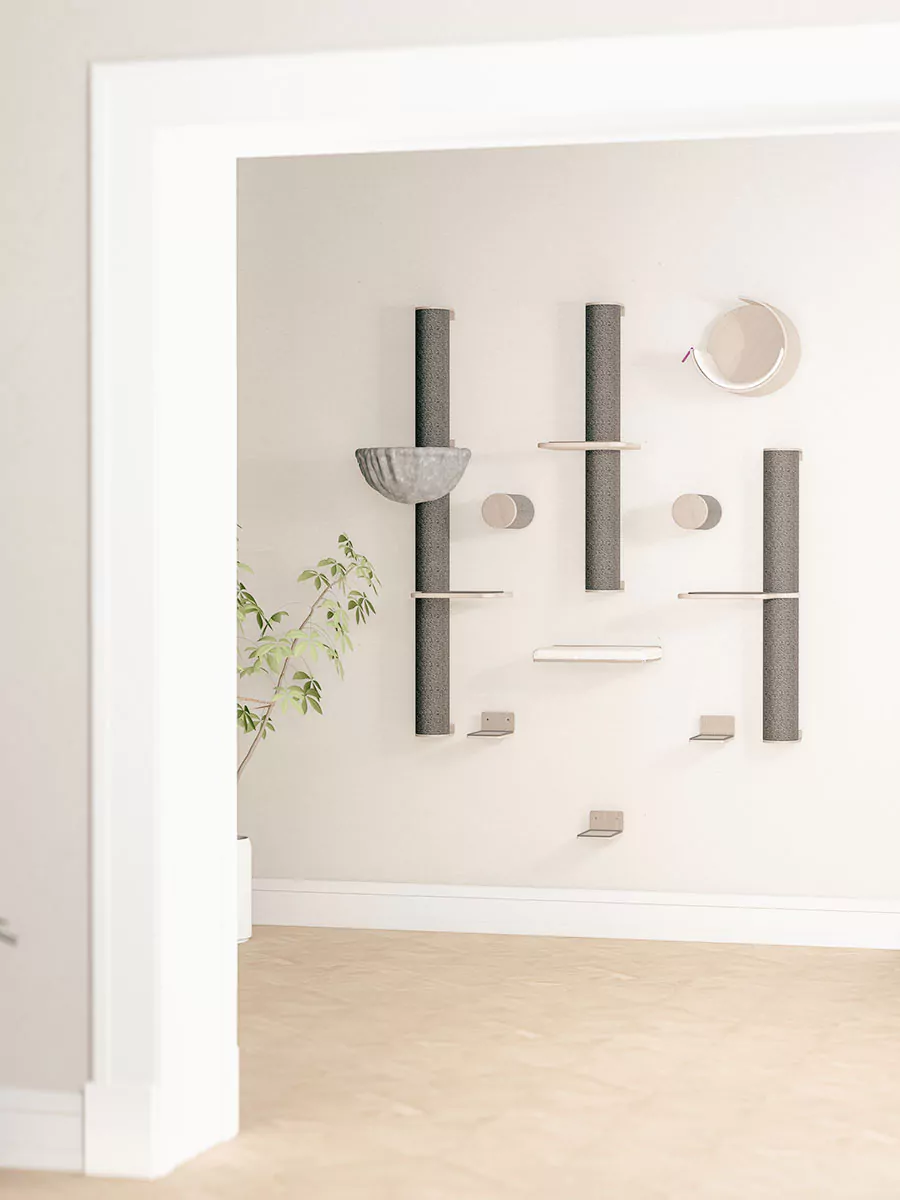 Deze veelzijdige set kan op verschillende manieren worden samengesteld. Houd rekening met de grootte en klimcapaciteit van jouw kat. Heb je kleine katten of katten die moeilijk kunnen klimmen? Hang de onderdelen dan dichter bij elkaar. Heb je grote en energieke katten? Overweeg dan de onderdelen verder uit elkaar te hangen.