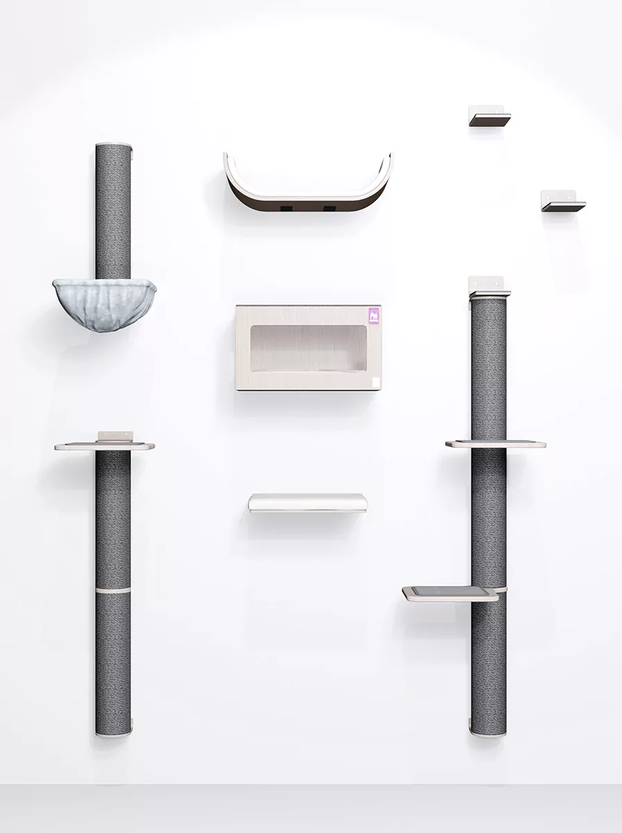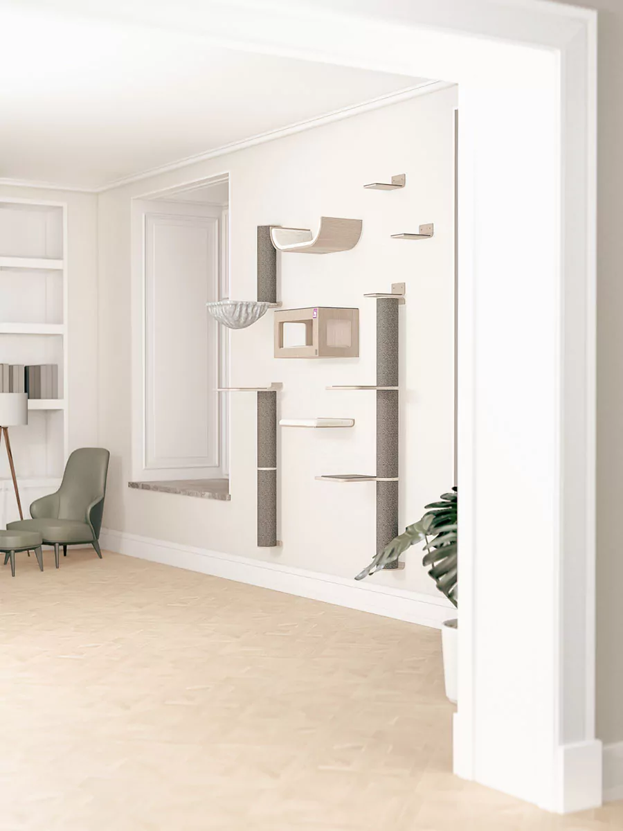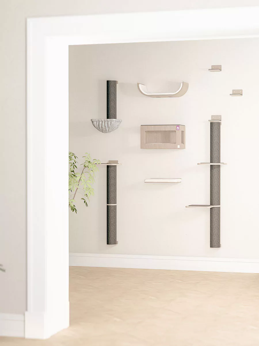 Deze veelzijdige set kan op verschillende manieren worden samengesteld. Houd rekening met de grootte en klimvaardigheid van je kat(ten). Heb je kleine katten of hebben ze moeite met klimmen? Hang de onderdelen dan dicht bij elkaar. Heb je grote, energieke katten? Overweeg dan om de onderdelen verder uit elkaar te hangen.