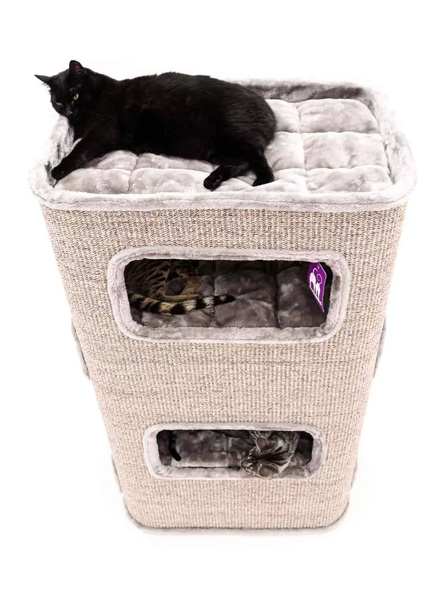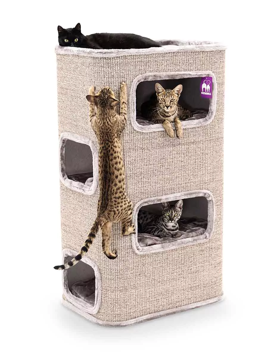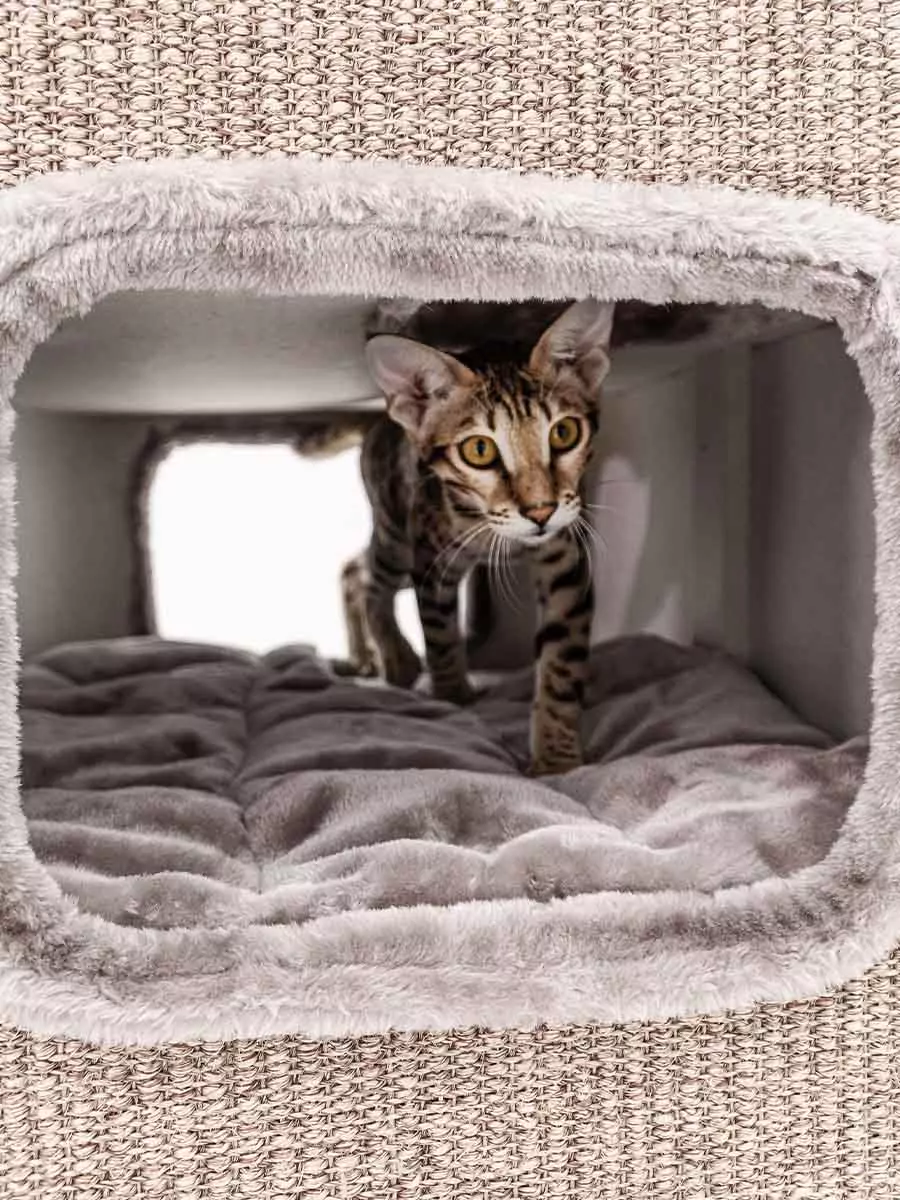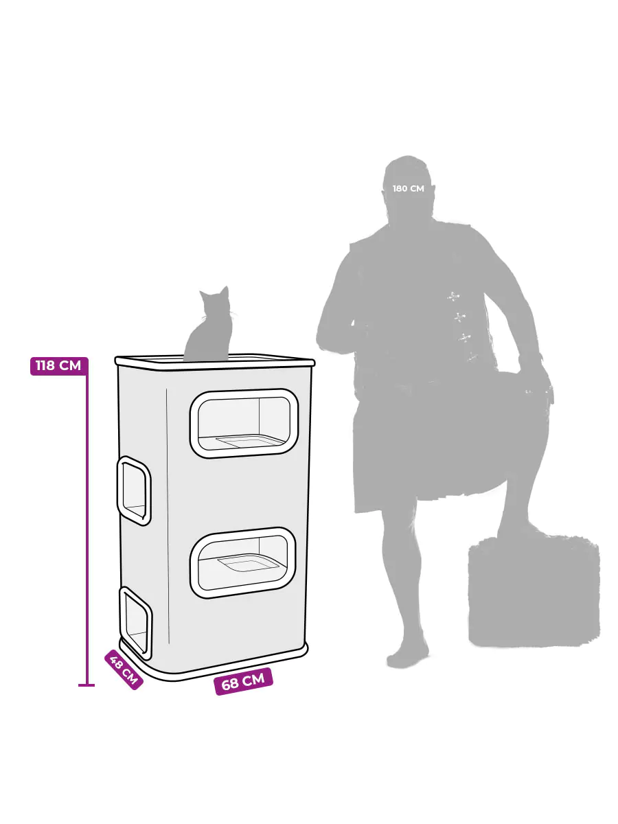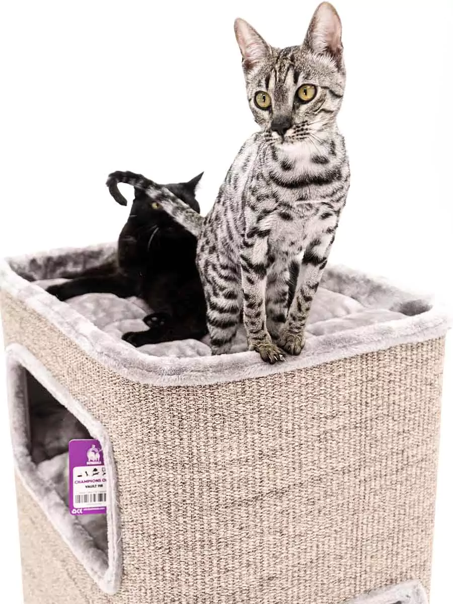 Je zult geen goud of juwelen vinden in deze krabpaal, maar iets veel, veel beter: ultiem gelukkige katten! De Vault 118 doet zijn naam eer aan, want deze krabtoren is zo stevig als een kluis. En hij is ontworpen om enkel comfort te bieden. Je kat kan zich ontspannen op het zachte pluche kussen bovenop, en binnenin zijn er vier ruime slaapzones waar hij heerlijk kan ronken. De ingangen zijn slim geplaatst: twee aan de voorkant en twee aan de zijkant, precies waar je kat ze wil hebben. Een andere interessante eigenschap is dat de krabpaal volledig bekleed is met extra stevig sisal, ideaal voor katten die anders liever je meubels zouden gebruiken.