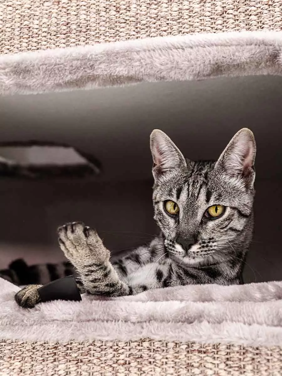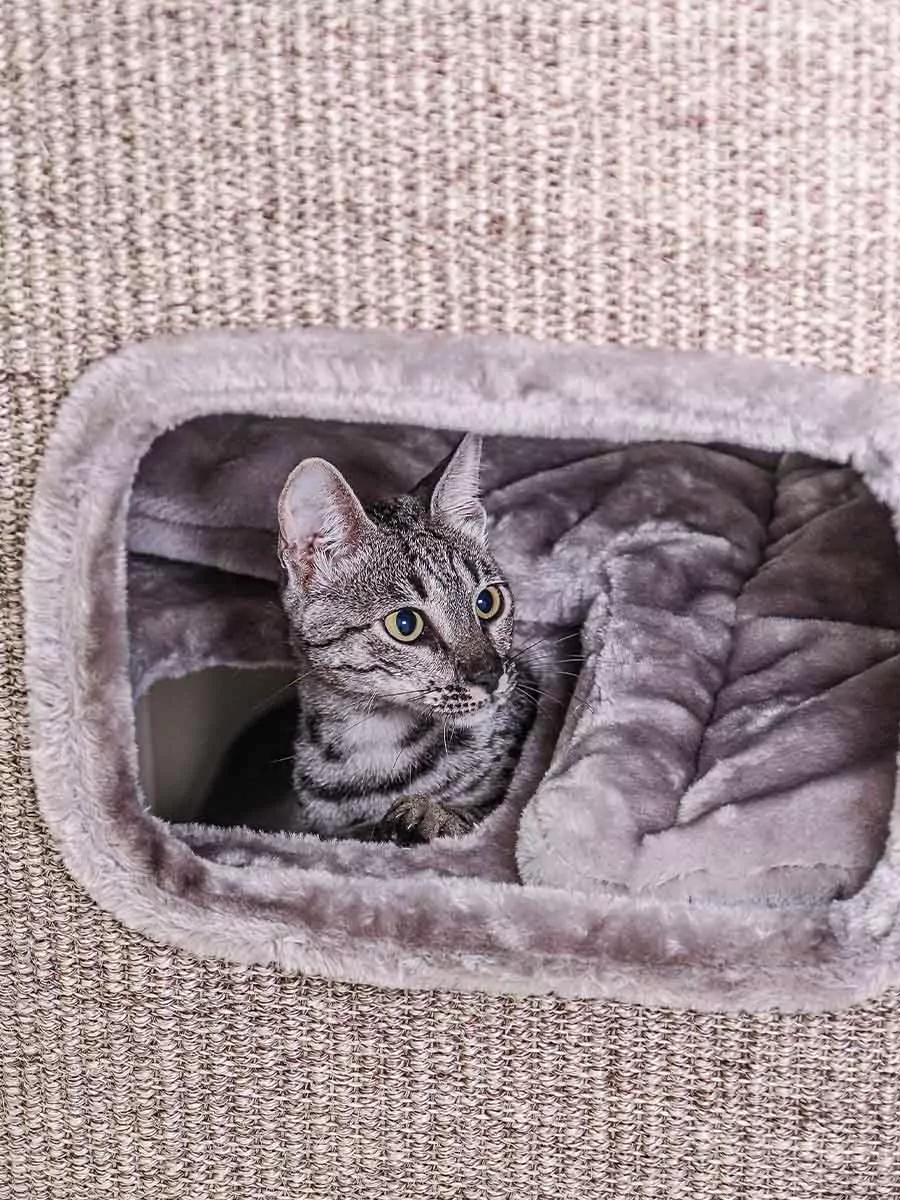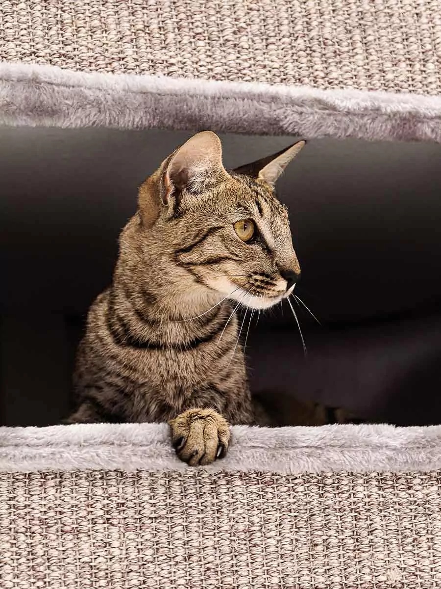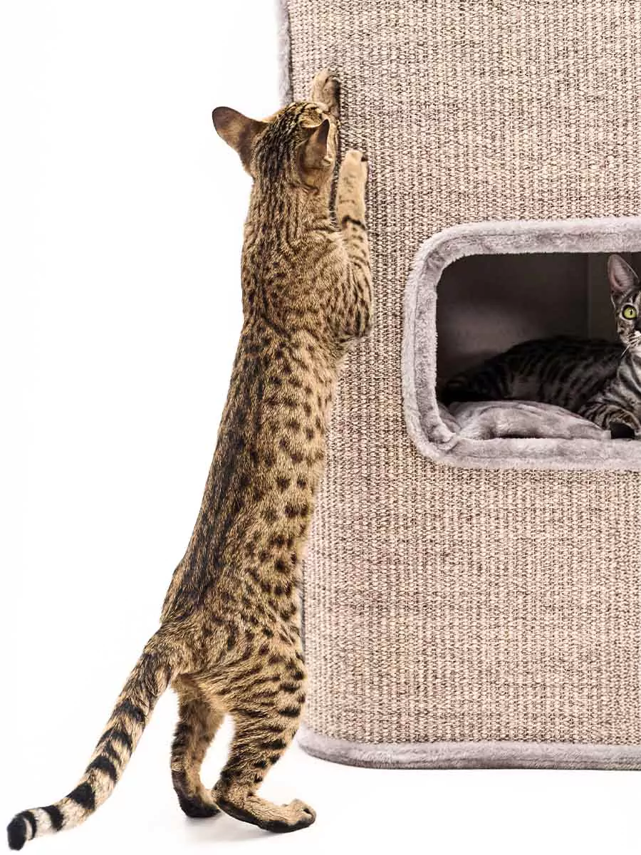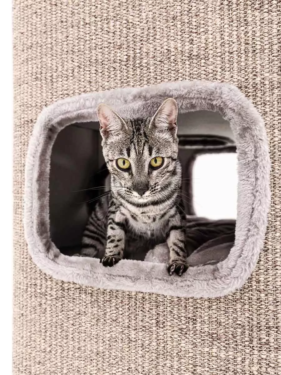 Je zult geen goud of juwelen vinden in deze krabpaal, maar iets veel, veel beter: ultiem gelukkige katten! De Vault 118 doet zijn naam eer aan, want deze krabtoren is zo stevig als een kluis. En hij is ontworpen om enkel comfort te bieden. Je kat kan zich ontspannen op het zachte pluche kussen bovenop, en binnenin zijn er vier ruime slaapzones waar hij heerlijk kan ronken. De ingangen zijn slim geplaatst: twee aan de voorkant en twee aan de zijkant, precies waar je kat ze wil hebben. Een andere interessante eigenschap is dat de krabpaal volledig bekleed is met extra stevig sisal, ideaal voor katten die anders liever je meubels zouden gebruiken.