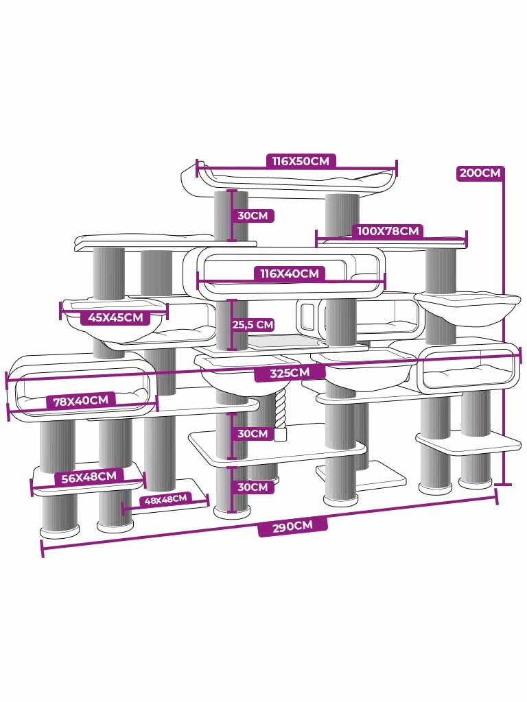 Wij presenteren onze Norwegian 200: een fantastische XXL-krabpaal die uw huis transformeert in een echt speelparadijs voor katten! Deze krabpaal brengt het allerbeste in uw huis, want dit kattenmeubel is stabiel, stevig en bovenal zeer groot. In deze krabpaal kunnen uw katten eindeloos spelen en klimmen. Maar ook heerlijk slapen. Want met zoveel mandjes, hangmatten en zachte planken is er altijd een plekje waar uw kat zich kan terugtrekken en kan uitrusten na een geweldige dag.